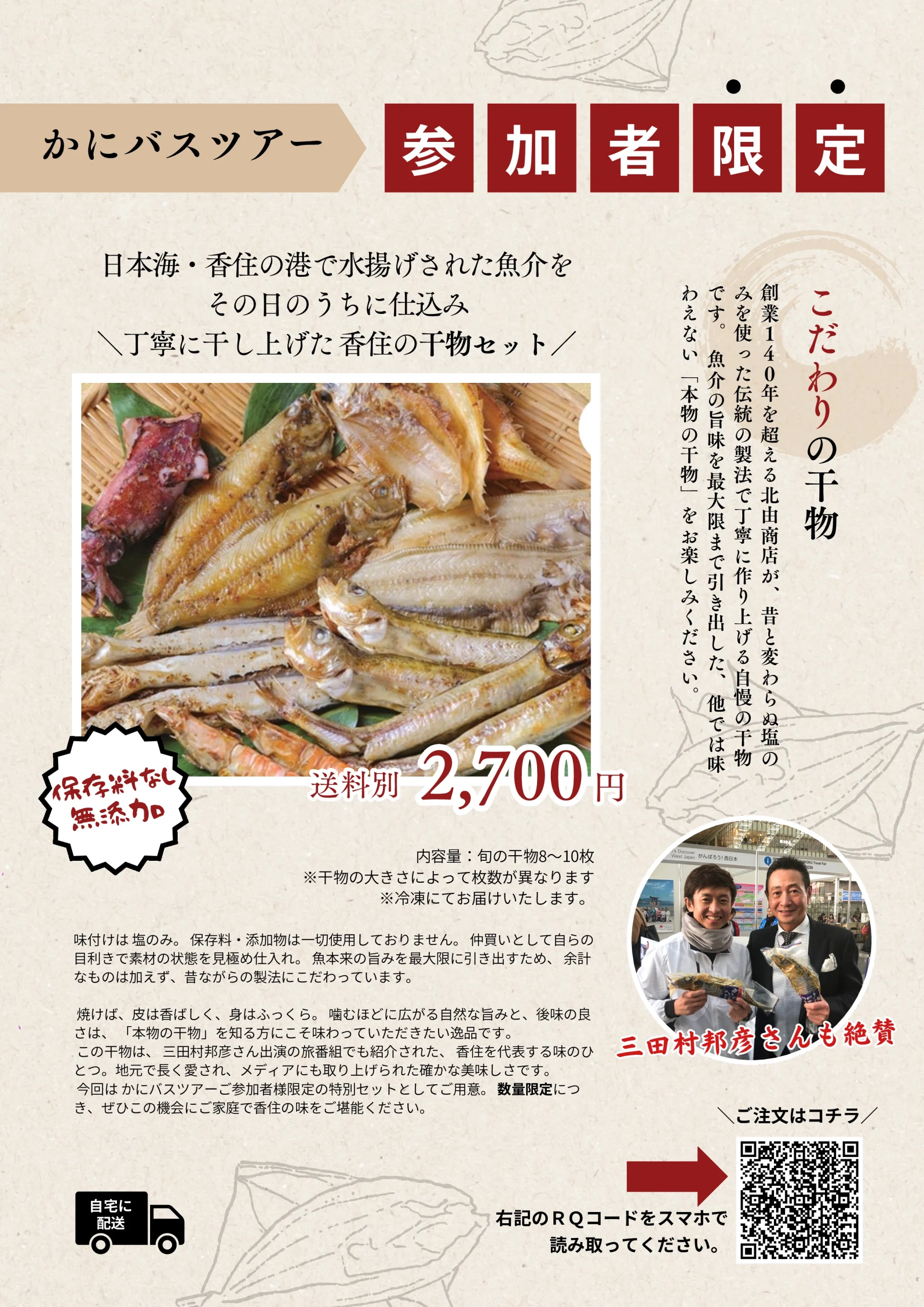 この干物は、三田村邦彦さん出演の旅番組でも紹介された、香住を代表する味のひとつ。